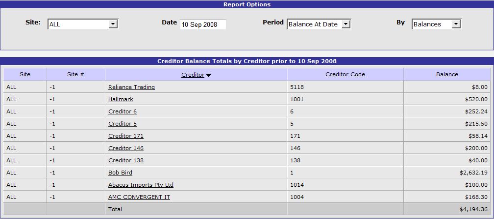 Balances, outlines the Creditor balances for Creditors with transactions or payments at the specified Site during the selected period. The report displays the Site Name, Site Number, Creditor Name, Creditor Code and Balance. The Creditor Name can be selected to open the Creditor Maintenance screen, allowing you to edit the Supplier.