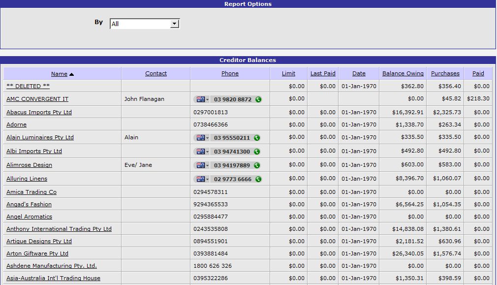 Non Zero Balance, displays the balance details for all Creditors in the Portal with a non-zero balance outstanding. Information in this report includes the Creditor Name, Contact Person, Phone Number, Credit Limit, Last Payment Total, Date of Last Payment, Balance Owing, Purchase Total and Payment Total for each Creditor. A Creditor Name can be selected to open the Creditor Maintenance screen in order to edit the details of the Supplier.