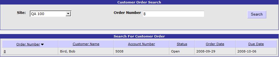 The Find Order link in the Orders section of the Customer Orders Menu opens the Customer Order Search screen. This screen allows you to search for an order by its order number. Enter the Order Number to search for and select the Site to search. Press the Search button to load the details of the order. The Order Number, Customer Name, Account Number, Status, Order Date and Due Date are displayed for the order. Select the Order Number link in the report to open the Customer Orders screen with the details of the order loaded.