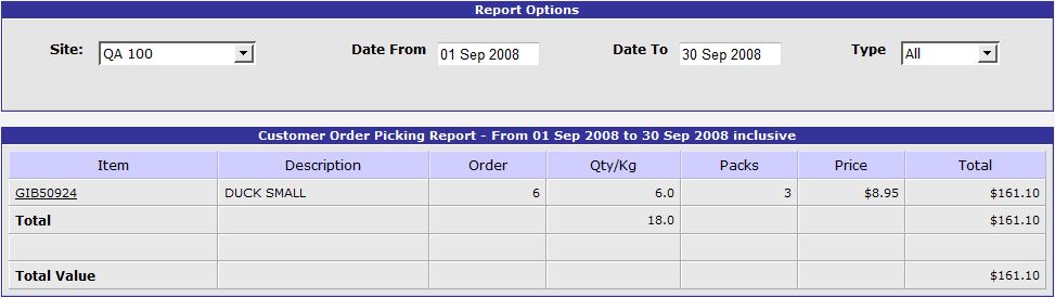 The Picking List link in the Reports section of the Customer Orders Menu opens a report that displays the items ordered at the selected Site during the specified date range. The Type drop-down list allows you to filter the report according to order status - Pending, Finalised, Delivered or All. The report displays the Item Code, Item Description, Order Number, Quantity Ordered, Packs Ordered, Unit Price and Line Total is displayed for each item ordered. Totals are displayed for each order and the report as a whole.