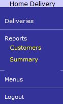 This tutorial is concerned with the Home Delivery Menu. The Home Delivery Menu can be opened by selecting Menus, Customer, Services and Home Delivery from the Navigation Menu. Two sections exist in the Home Delivery Menu, Deliveries and Reports, as well as the standard Menus and Logout links.