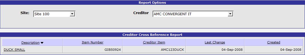 It is possible to review the Cross Reference Numbers for a Supplier by selecting the Supplier XRef link from the Contracts section of the Procurement Menu. This opens the Creditor Cross Reference Report which lists all known Cross Reference Numbers for a Site by Creditor. The report lists the Item Description, Item Number, Creditor Item Number (Cross Reference Number), Date of the Last Change to the Cross Reference and the Date it was Created.