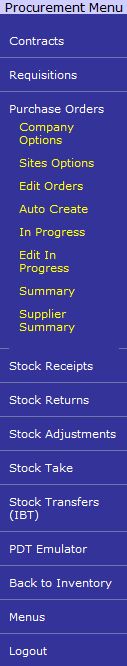 In this tutorial, we will be looking at the Purchase Orders section of the Procurement Menu. The Procurement Menu can be opened by selecting Menus, Inventory and Procurement from the Navigation Menu. Two links are provided to allow you to review the Company Options and Site Options for Purchase Orders.