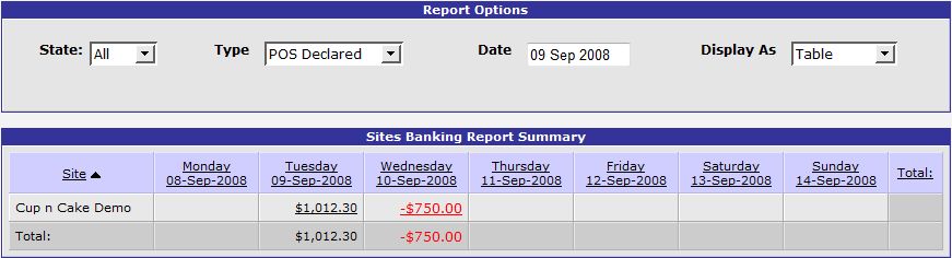 The Site Banking link in the Balance Reports section of the Sales Menu opens the Sites Banking Report Summary which displays details about each Site's banking totals for the week including the selected Date. This report can be filtered by State and the Type drop-down list can be used to view details of money banked, in the safe, declared by the POS or the till variances for each Site. The Display As drop-down list allows you to view tabular or graphical information for the report. Selecting a total in this report drills down to the Cashup Detail Report.