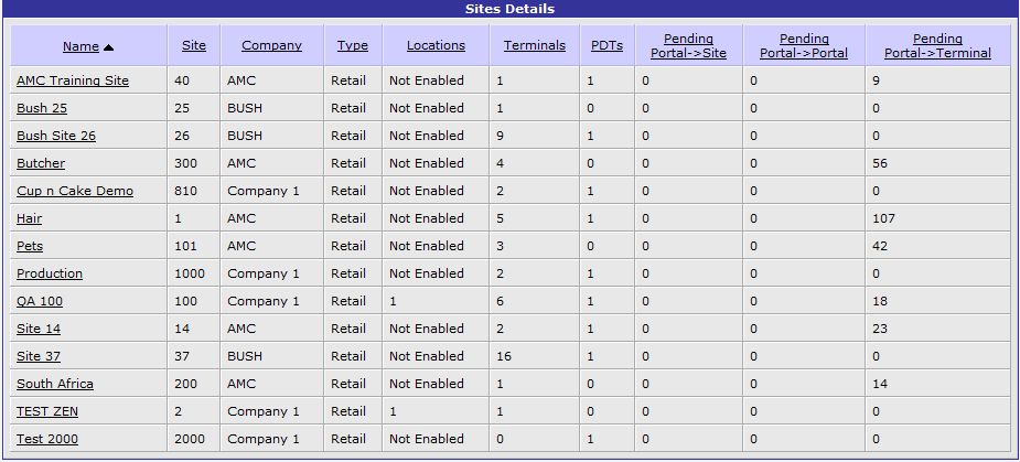 Another useful summary of the Sites in a Company can be accessed by selecting the Information link in the Sites section of the Site Menu. The Site Terminal Details Report lists the number of Locations and Terminals in each Site of the Company. Like the Site Details Report, clicking on the Name of a Site opens the Site Maintenance screen for the selected Site. Other details in the report include the Site Number, Company Name, Type of Site (Retail or Wholesale), and the Number of Pending Items to be sent from the Portal to the Site or Terminal.