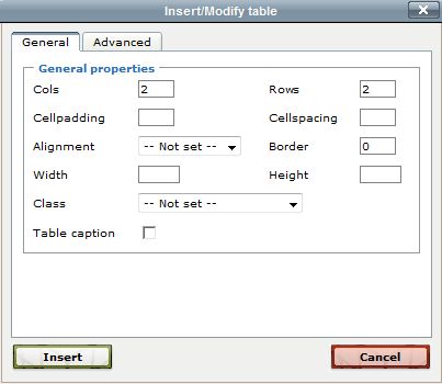 General, allows you to set the number of Columns (Cols) and Rows in the table, the Border width, Cell Padding and Cell Spacing (all in pixels) and the table Alignment in the page. The General tab also provides fields to set the Width and Height of the table in pixels, the Class for formatting via external CSS style sheet and whether to display a Table Caption for the table.