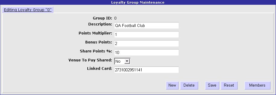 Click on the link to create a new group and a popup menu appears. Select Create New Loyalty Group from this popup menu and you will be taken to the Loyalty Group Maintenance screen.