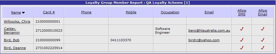 This report displays details regarding the members in the group. Their name, card number, home phone number, mobile number, occupation and email address are displayed, as well as whether the member has opted to receive SMS messages and emails from the Portal. By clicking on the member name you can open the Member Maintenance screen to edit their details and clicking their email address in the report opens a new message in your default email program (for example, Microsoft Outlook) to send them an email.