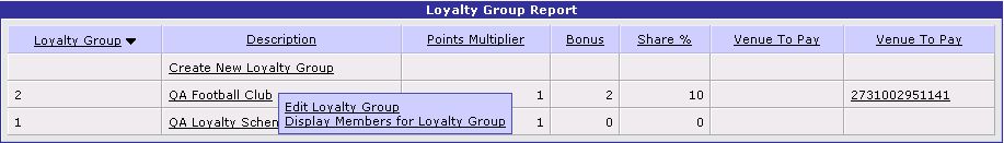 Open the Loyalty Group Maintenance screen again by clicking on the Edit Groups link in the General Maintenance section of the Loyalty Navigation Menu. This time though, select an existing Member Group and click on its name. A popup menu appears with two selection options: